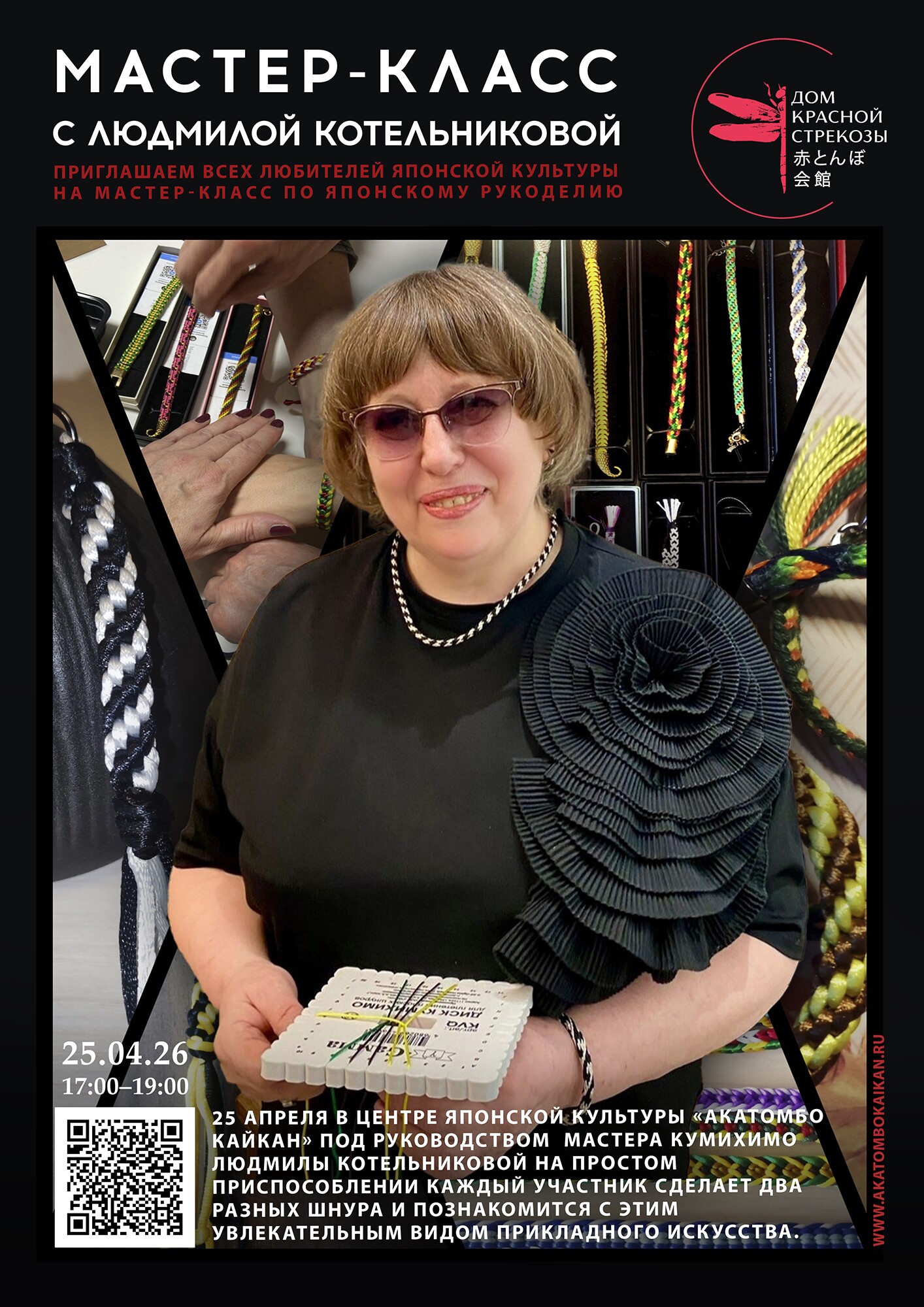 25 апреля 2026 года Центр японской культуры «Акатомбо кайкан» приглашает на первое ознакомительное занятие по кумихимо с Людмилой Котельниковой.